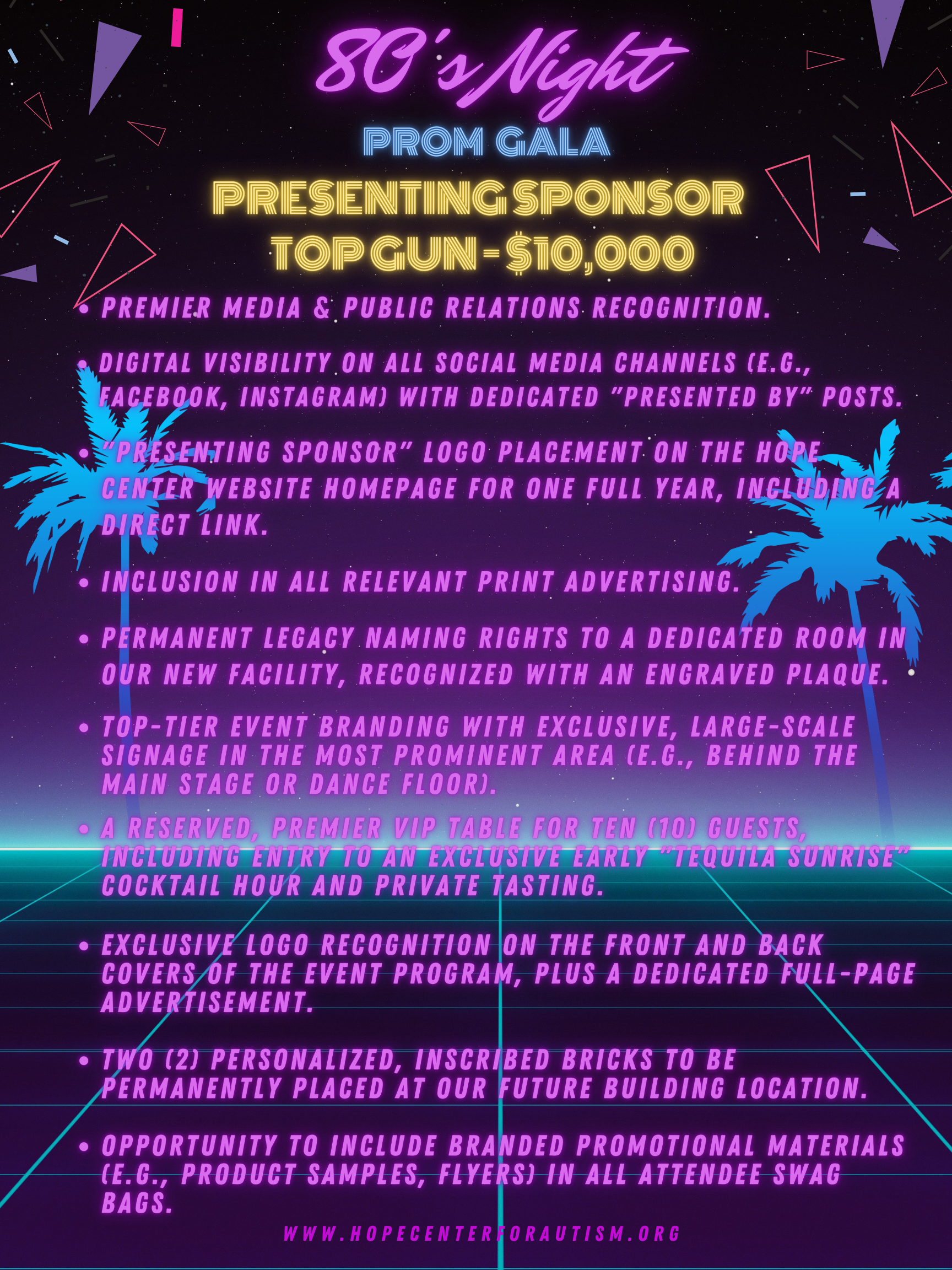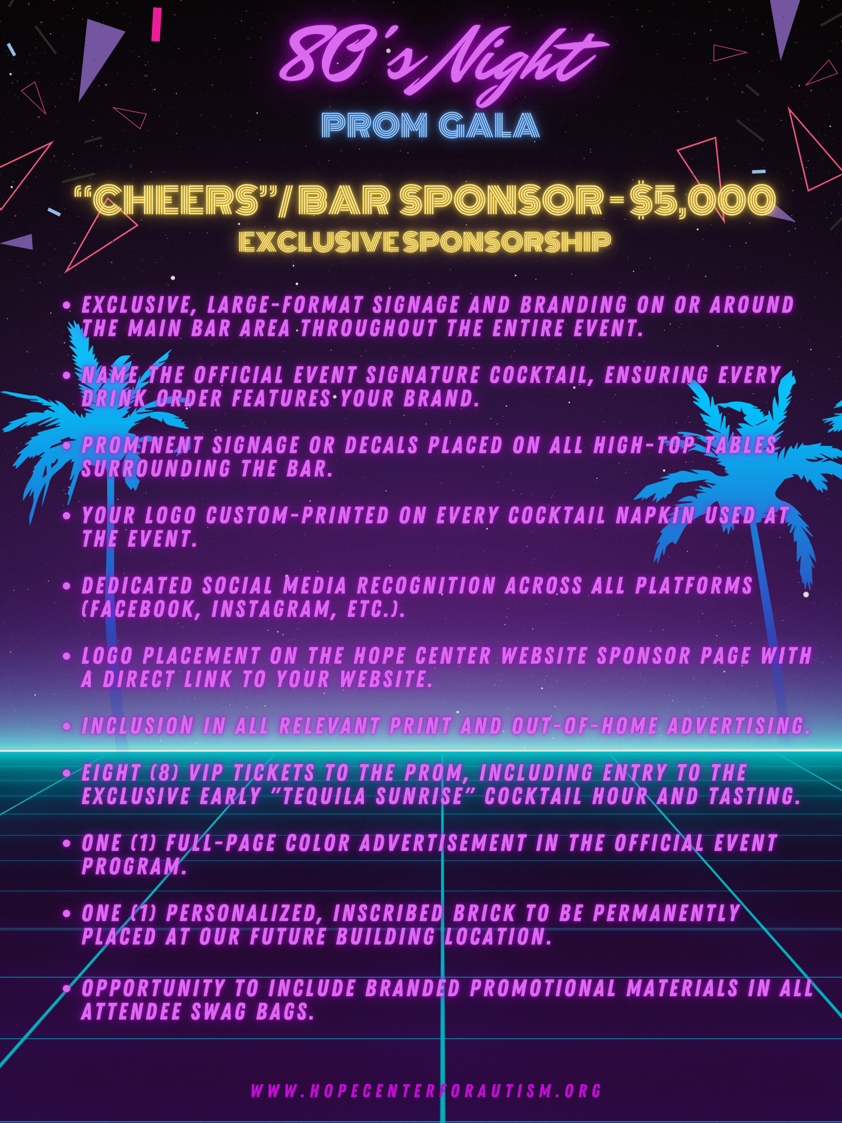 Prom Sponsorships Top Gun Sponsor $10,000.00 Purchase Added! "Cheers" Bar Sponsor $5,000.00 Purchase Added! 80's Themed Table Sponsor $3,000.00 Purchase Added! Tequila Sunrise VIP Event Sponsor $2,500.00 Purchase Added! "Miami Vice" Cigar Sponsor $2,000.00 Purchase Added! "Back to School" Sponsor $750.00 Purchase Added!